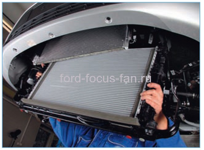 В чём же надобность в снятии радиатора?! А надобность может возникнуть в случае его загрязнения или же повреждения. Демонтаж радиатора на Ford Focus 2 производится в сборе с вентилятором охлаждения. Также стоит обратить внимание, что к радиатору крепится конденсатор автомобильного кондиционера, который не снимается.