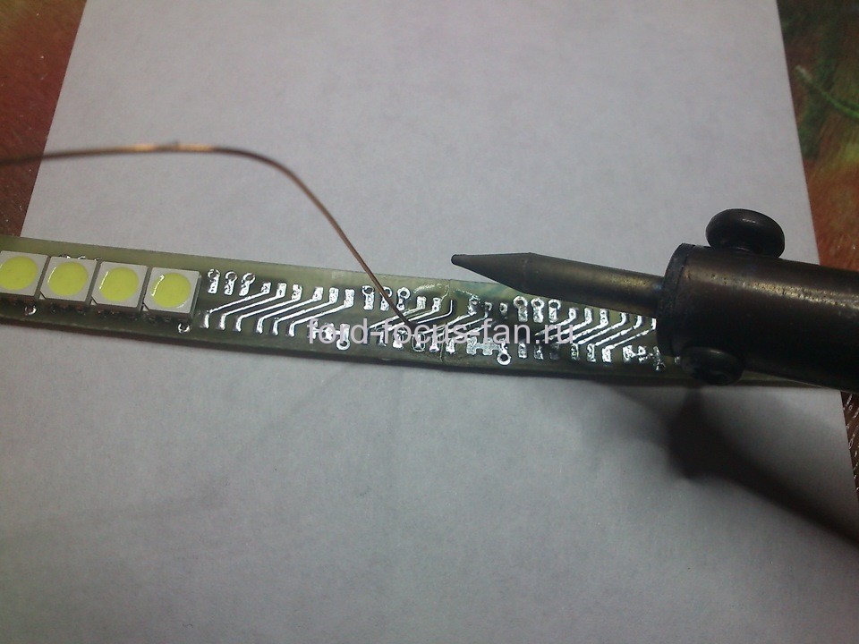 берём медную жилу из провода витая пара и аккуратно напаиваем поверх повреждения дорожки